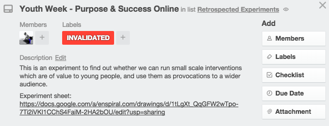 Pro Tip: we store all of our experiment sheets on Google Docs, linked to from our Trello board. It’s handy, but it’s not perfect.
