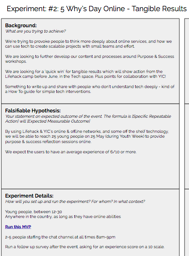 An example might be that we want to learn how we can best promote one of our events. In response, I’d write an experiment which tested 3 different channels: Facebook, Twitter and Print Advertising. The next time we ran an event, we might get a bit more nuanced, and write an experiment for the type of language we used. But we also scaled this up to whole initiatives we were running — such as a Lifehack Weekend — and we would assess the experience of people attending if we changed the format of the weekend.