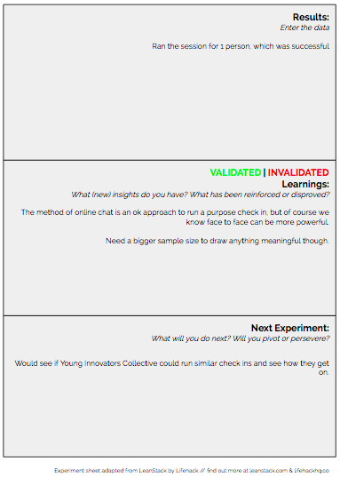 Learning from running the experiment is vital. This is where the second half of the Experiment sheet comes in handy.