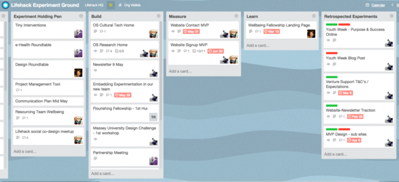 Having a hub where all the experiments live is a great way to see things visually. I mentioned LeanStack before — but we quickly out grew the 9 or so slots they had for completed experiments, so we moved to Trello. It’s a useful free tool which gave us the flexibility to set up our own digital space. At any one time our Experiment Ground might look a bit like this: