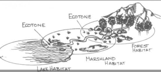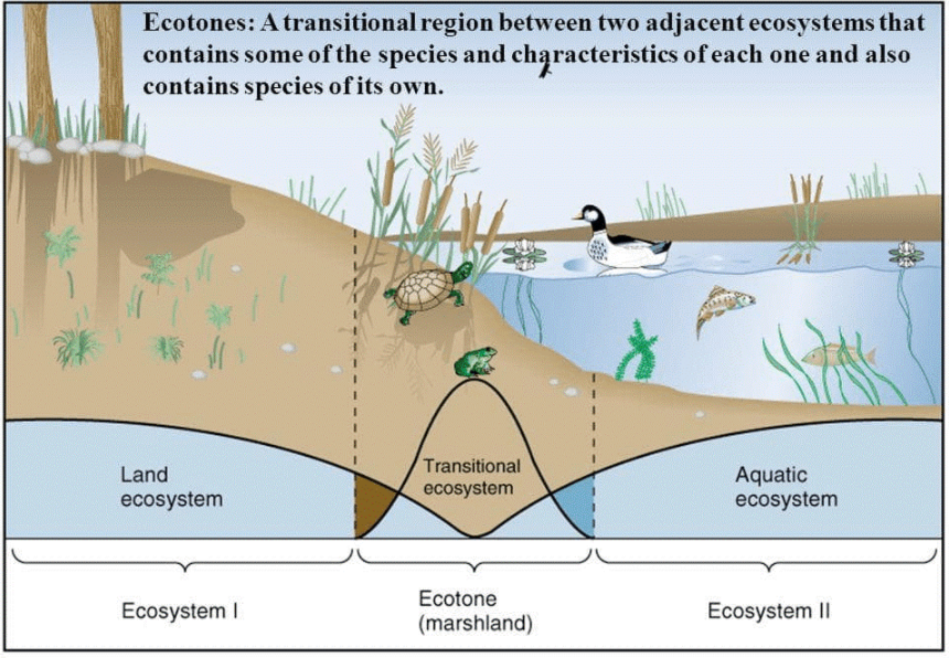 Think of Ecotones as the transitional space between two ecosystems - such as below the high tide mark on a beach, the tidepools and slope down to where a seagrass meadow begins. Or the reeds on the edge of a wetland and a forest.