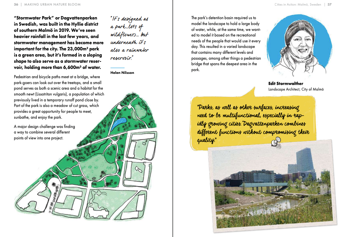 An example shared from Naturvation in the 'Making Urban Nature Bloom' book shows the design of a park to address stormwater run off, improve citizen wellbeing, and benefit biodiversity.