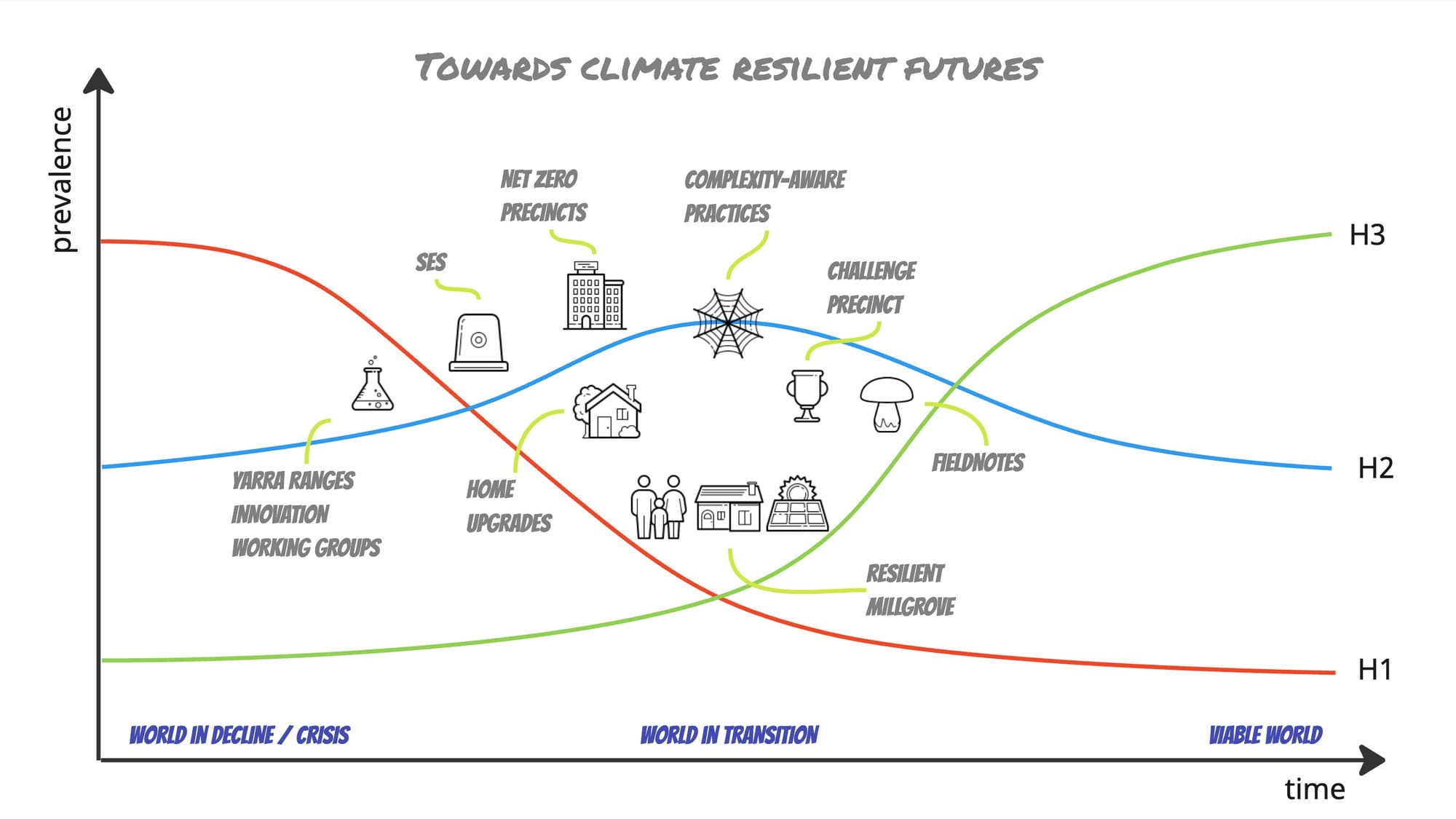 As I mentioned before, I realised I had a few plates spinning in work, volunteering and community life (not to mention parenting), so the other day I started mapping them out across the 3 horizon framework (Sharpe - nice resource from my friend Kate Goodwin on how to use it here), and realised that I cluster a lot of my work in the H2 area - bridging between unsustainable realities, and the emerging practices and systems (as many of us do).