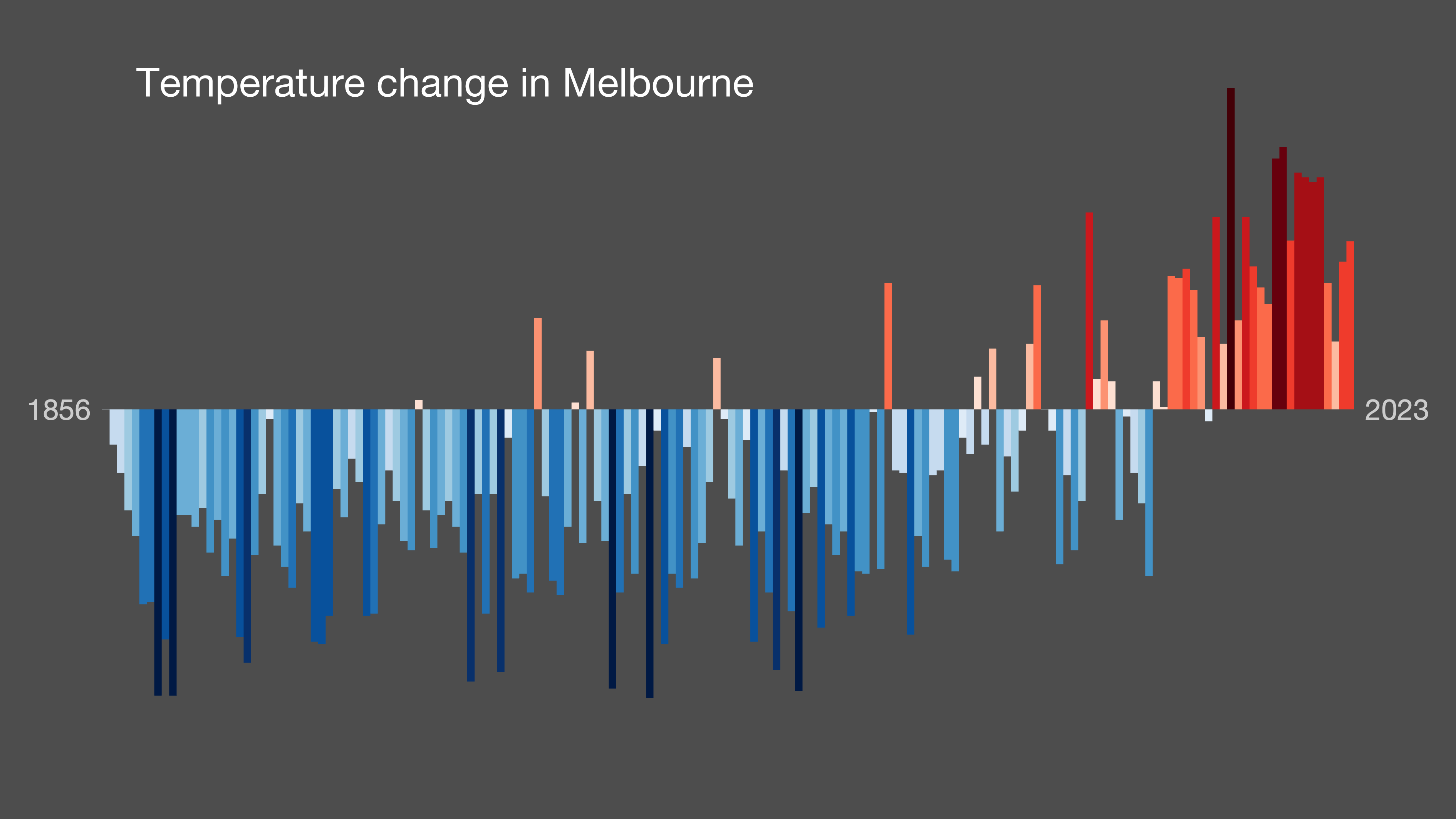 Fires, extreme weather, extreme heat - it's all already happening here in Australia and around the world. A quick check in with the climate stripes for Melbourne (above) shows us what we've brought about.