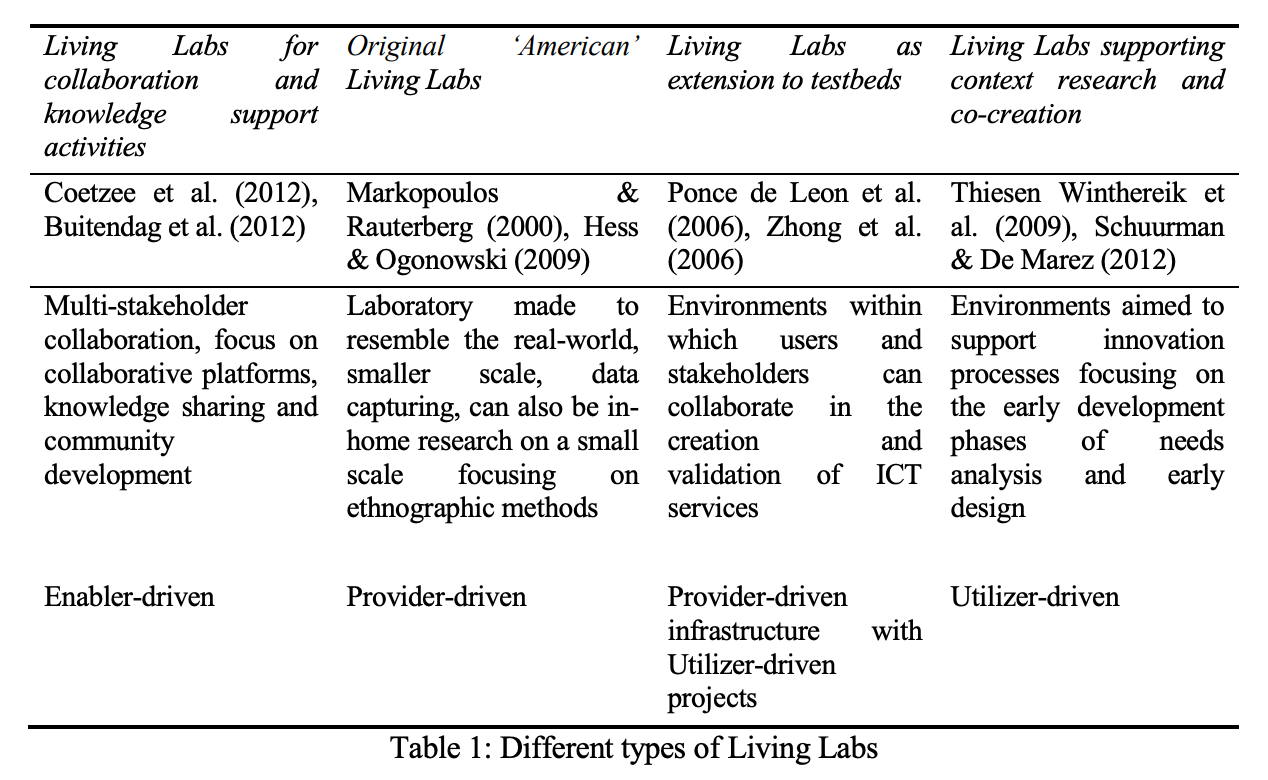 Again, living labs have also grappled with this, and there are various typologies in the literature, such as a 2013 one from Schuurman et al [2] in conjunction with the European Network of Living Labs (ENoLL):