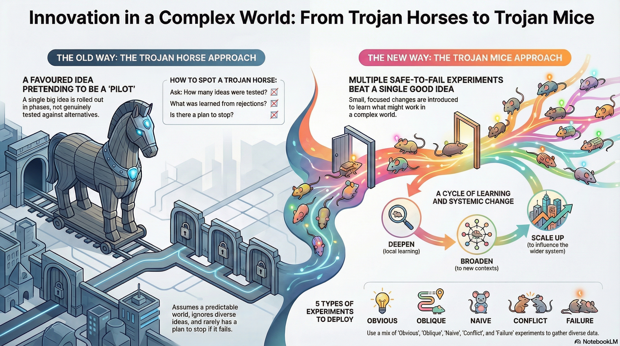 I got thinking about the role of small scale experimentation and its role in systems initiatives whilst co-leading a social innovation lab in Aotearoa NZ. Initially we used the language of prototyping, and latterly experimentation, but I've always really loved how evocative "Trojan Mouse" is as a term.